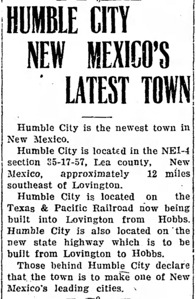Humble oil company did a good bit of exploration in the early days of the Hobbs oilfield. Humble City was founded about 1930 and had a post office for about 46 years.
