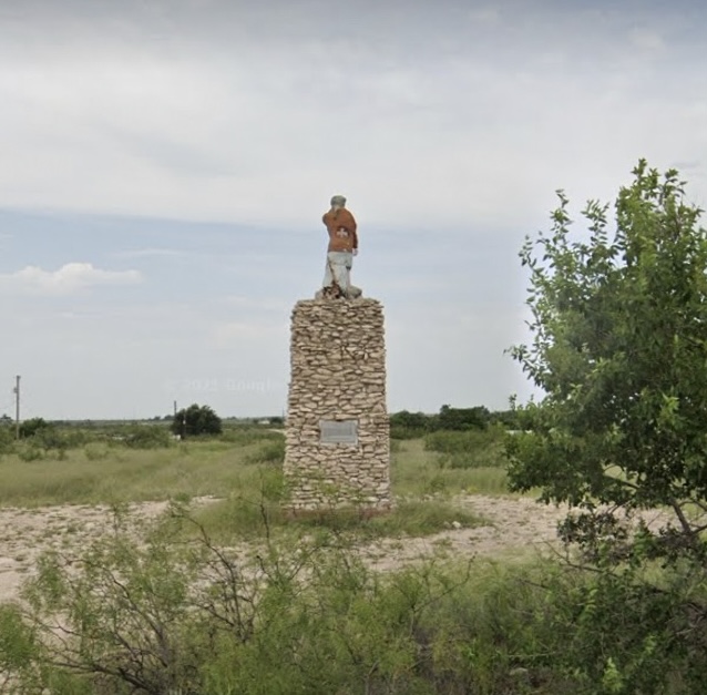 “Settled in 1885 and named for a marker at the springs a few miles west, monument remained a ranching community until oil was discovered in 1928. The Indian statue, called Geronimo by residents, was erected in 1928 by land developers. Monument has produced 4 world champion rodeo performers: George Weir & Roy, Betty Gayle & Jimmie B. Cooper. A centennial celebration was held in 1985.